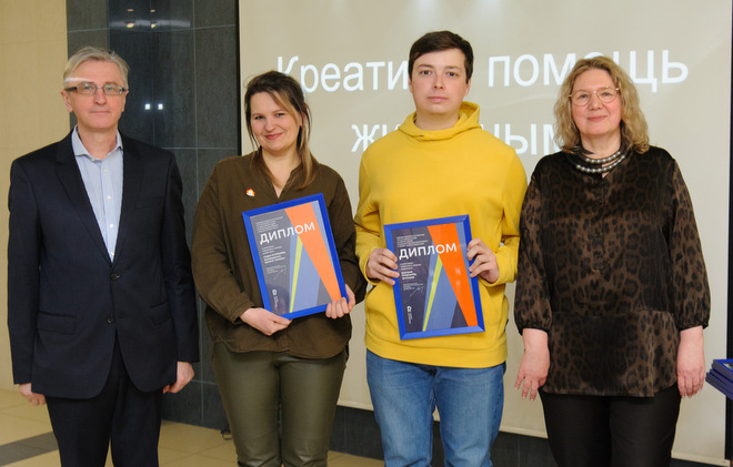 Цитата эксперта: «Понравилось название проекта и уважаю всё, что делает команда приюта, чтобы помочь найти бездомным животным свой дом». Дипломы в категории «Креатив в помощь животным» получили руководитель приюта собак и кошек «Ласка» Софья Куликова и фотограф Дмитрий Пушкарев.