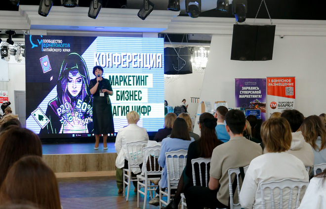 Пятая по счету конференция Сообщества маркетологов Алтайского края прошла в зале банкет-холла «Роял Парк». Визуальный стиль события разработан с ключевым образом мага-маркетолога, жонглирующего цифрами. Впервые на площадке события организовали выставку дизайн-проектов студентов Колледжа АлтГУ. Открыла конференцию руководитель Сообщества маркетологов Ольга Ефимова.