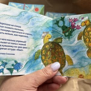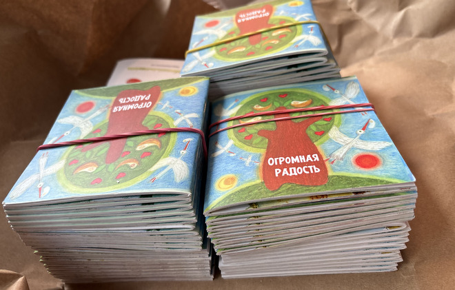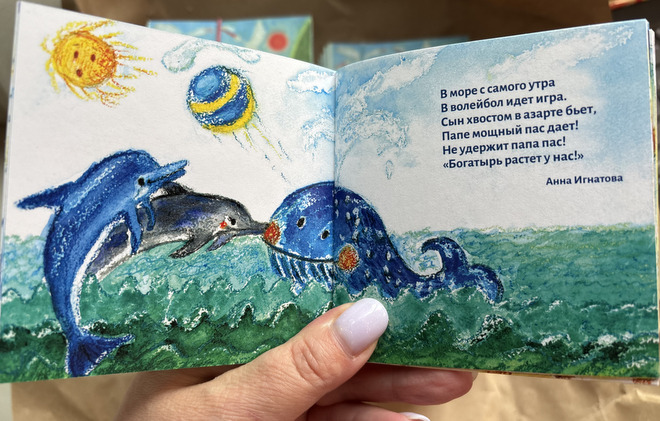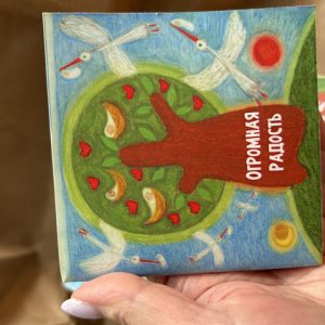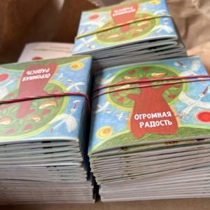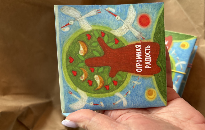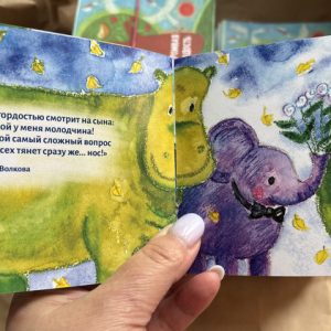 На форуме среди блокнотов и авторучек лежала авторская книжка «Огромная радость» со стихами, оформленная иллюстрациями Натальи Югонсон. Сюжет книжки строится на истории о том, как родители животные, насекомые, птицы усыновляют других детенышей.